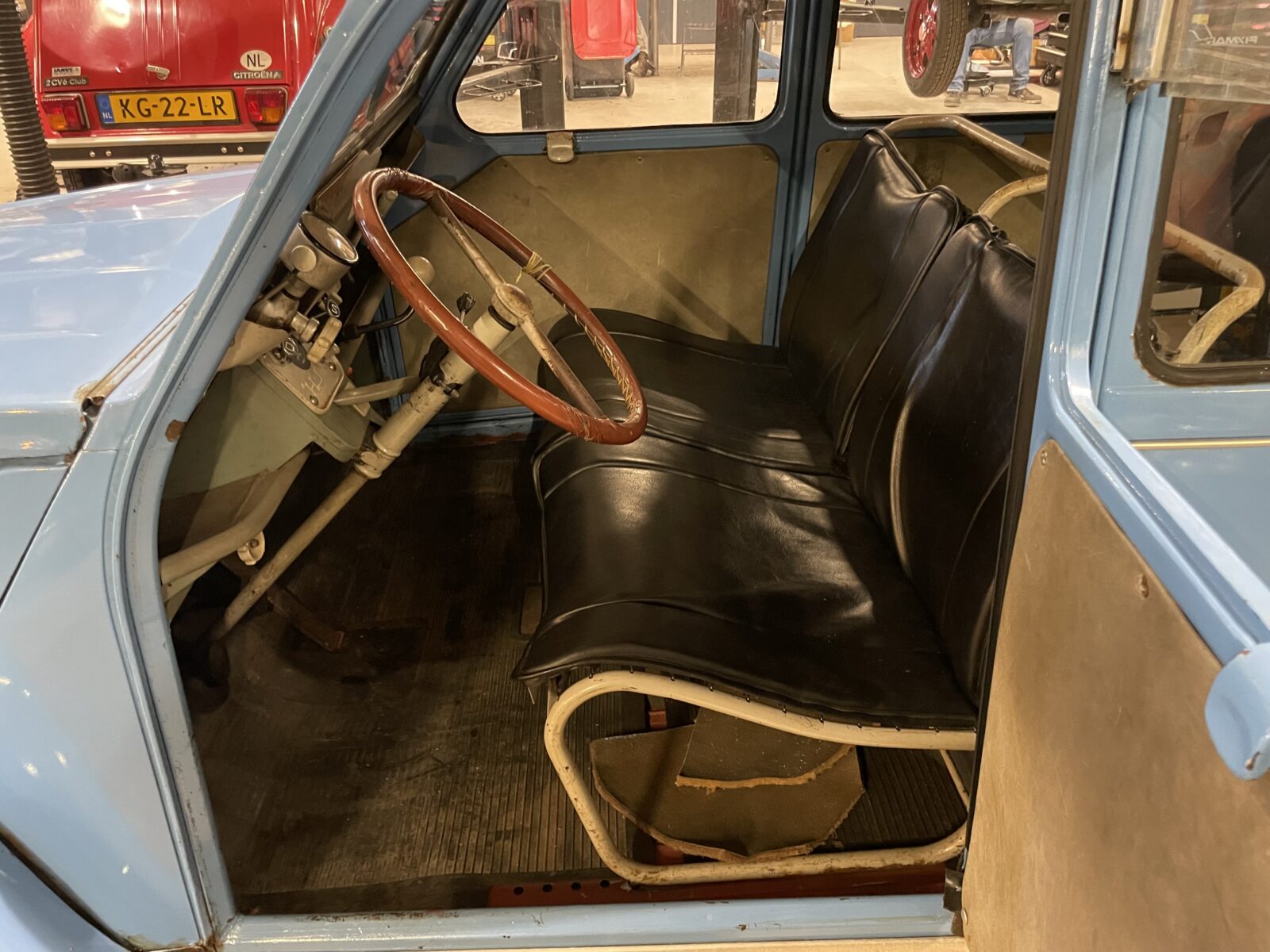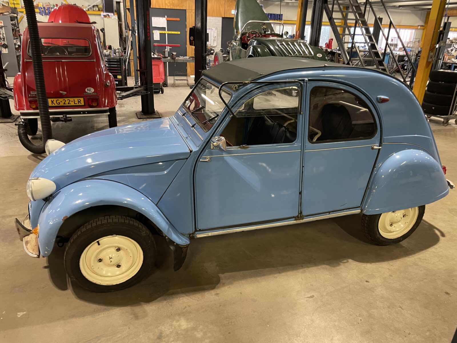 Nu verkopen we hem voor de klant omdat hij geen garage meer heeft en de eend niet op straat wil zetten. Hij reed er zelden mee, dus hij vraagt wel wat aandacht. De accu is vol en vers, de motor draait prima, hij rijdt ook, maar aan de remmen zit wat werk. En dan kan je ook gelijk een paar wiellagers en een aandrijfas aanpakken.