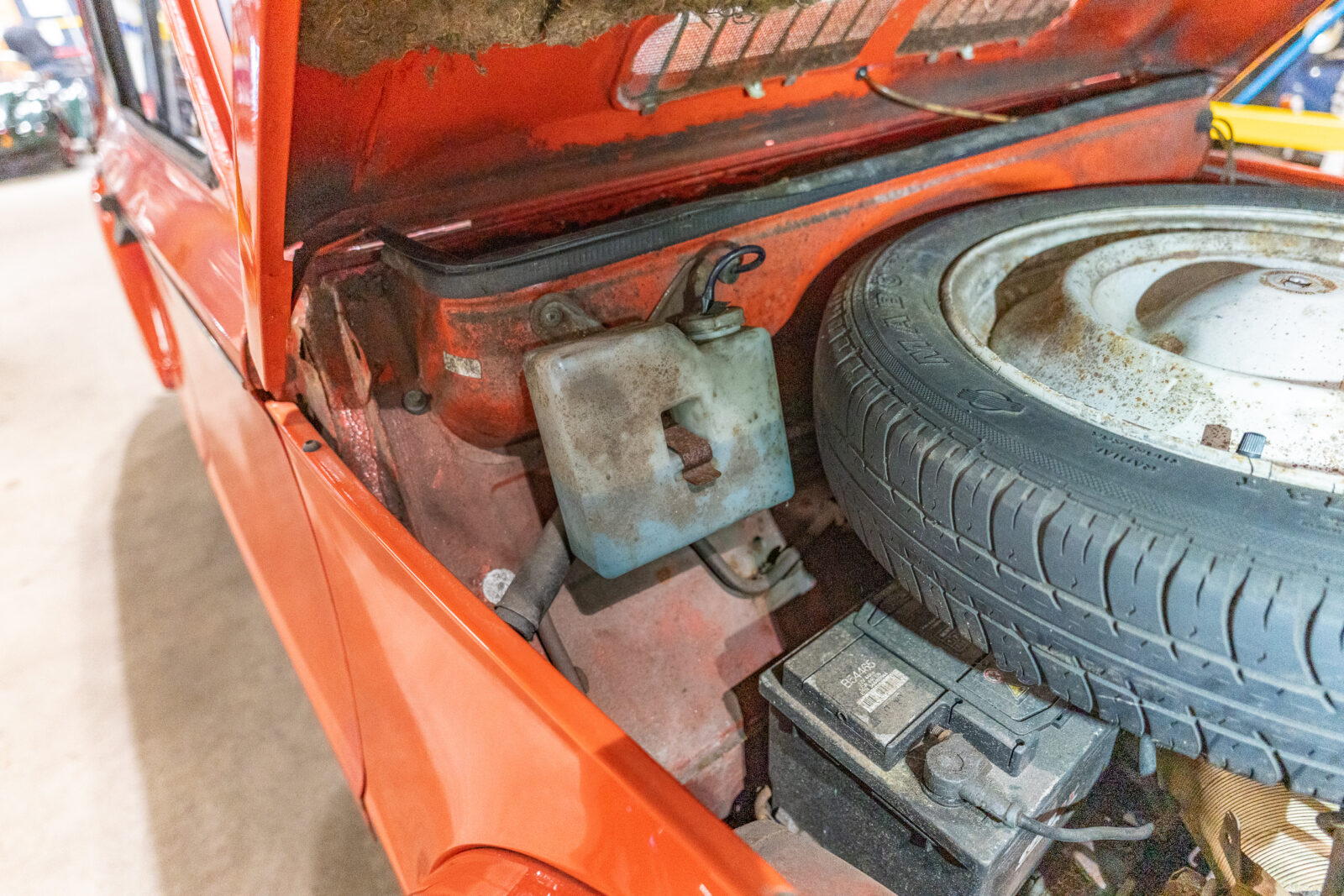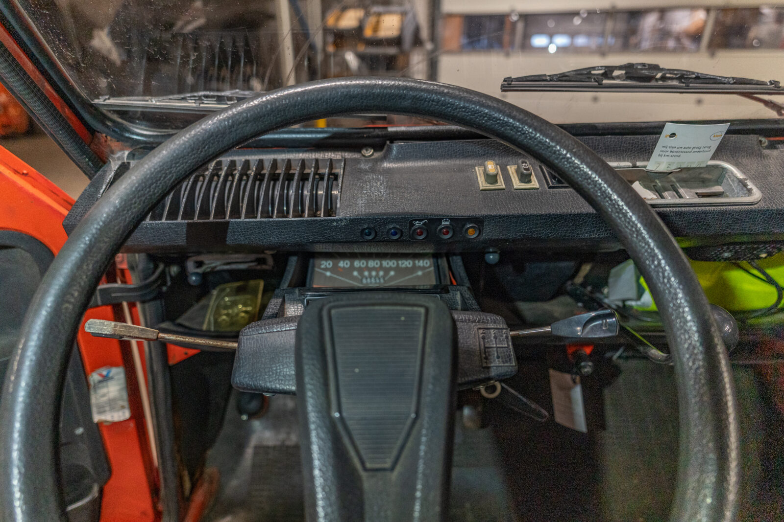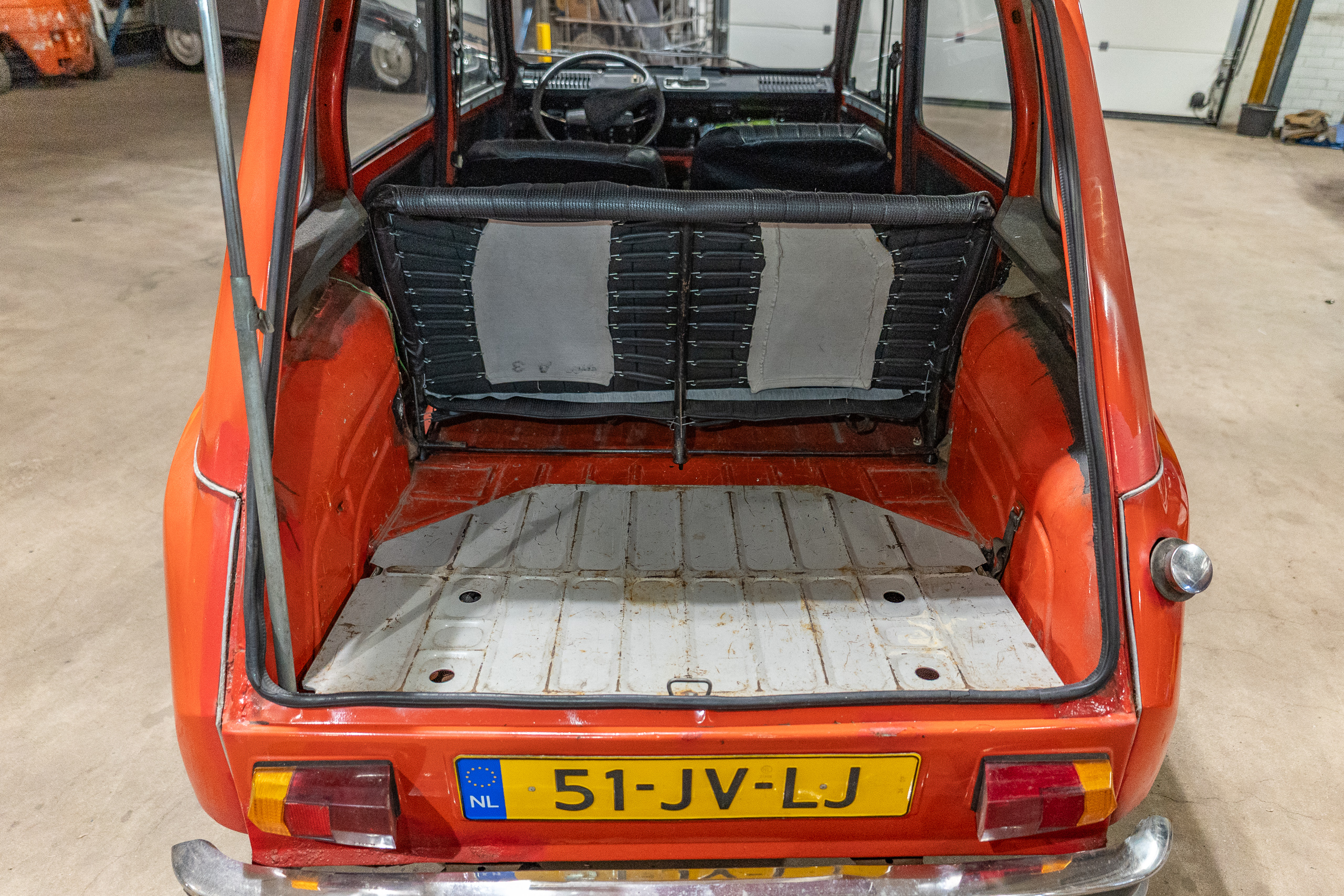 Want de kleur, Rouge Géranium, is van zichzelf lekker sprankelend. Het interieur is goed, hij rijdt uitstekend en de bodem en het chassis zijn in goede staat. In de kofferbak vind je wel 2 gaten, maar dan loopt het water er gewoon des te makkelijker uit… Bovendien is het nog niet ernstig genoeg voor afkeur, want hij heeft net een verse APK gekregen.